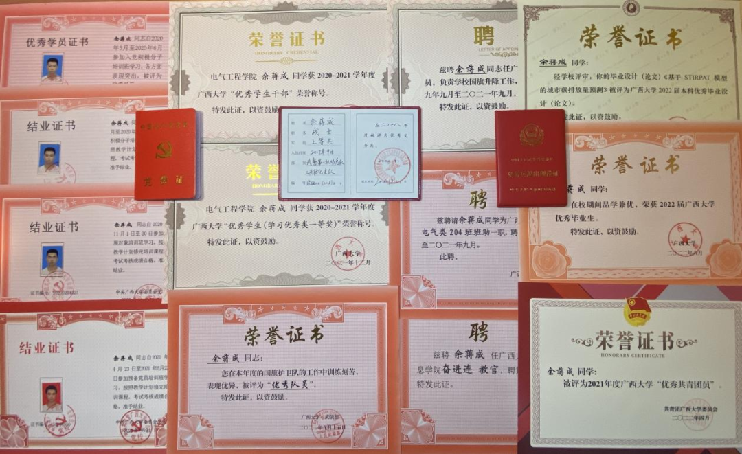 在校期间,余蒋成担任班级团支书、2020级新生班助、军训联络员、入党联系小组负责人、退伍大学生之家的征兵宣传负责人等,荣获必赢线路检测3003优秀学生干部、必赢线路检测3003优秀学生、必赢线路检测3003优秀共青团员、党课培训优秀学员、必赢线路检测30032022届优秀毕业生、优秀毕业设计等荣誉称号。